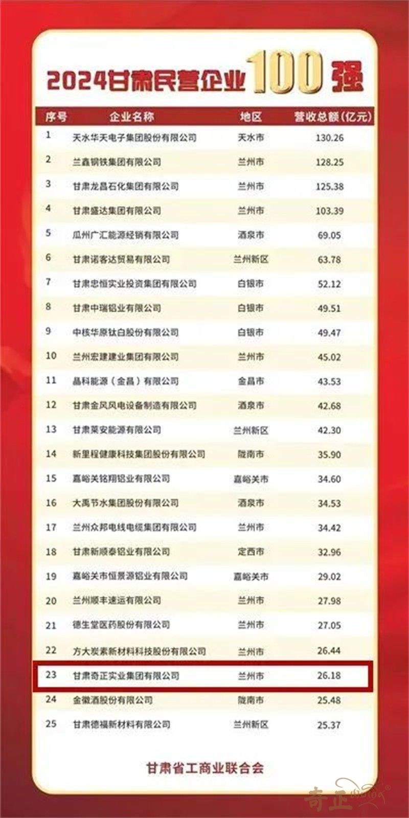 日前,2024 甘肅民營(yíng)企業(yè) 100 強(qiáng)發(fā)布會(huì)暨“民營(yíng)企業(yè)進(jìn)邊疆”活動(dòng)在酒泉隆重舉行。甘肅奇正實(shí)業(yè)集團(tuán)有限公司憑借其卓越的經(jīng)營(yíng)業(yè)績(jī)和穩(wěn)健的發(fā)展態(tài)勢(shì),榮膺100強(qiáng)榜單第23位。