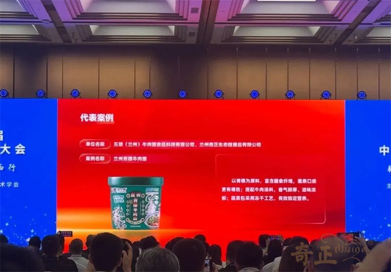 在大會(huì)代表案例展示中,由奇正生態(tài)健康品有限公司生產(chǎn)的蘭州青稞牛肉面榮登“2024—2025年度中國(guó)方便食品行業(yè)科技與產(chǎn)業(yè)創(chuàng)新新趨勢(shì)代表案例”,該產(chǎn)品以青稞為原料,富含膳食纖維,面條口感更有嚼勁;搭配牛肉湯料,香氣醇厚、滋味濃郁;蔬菜包采用凍干工藝,有效鎖定營(yíng)養(yǎng)。和傳統(tǒng)牛肉面相比,青稞牛肉面中青稞含量高達(dá)80%,膳食纖維和β- 葡聚糖含量更高,且青稞面餅非油炸,相對(duì)更健康。